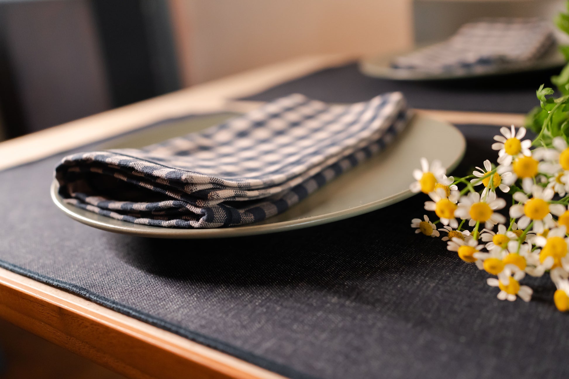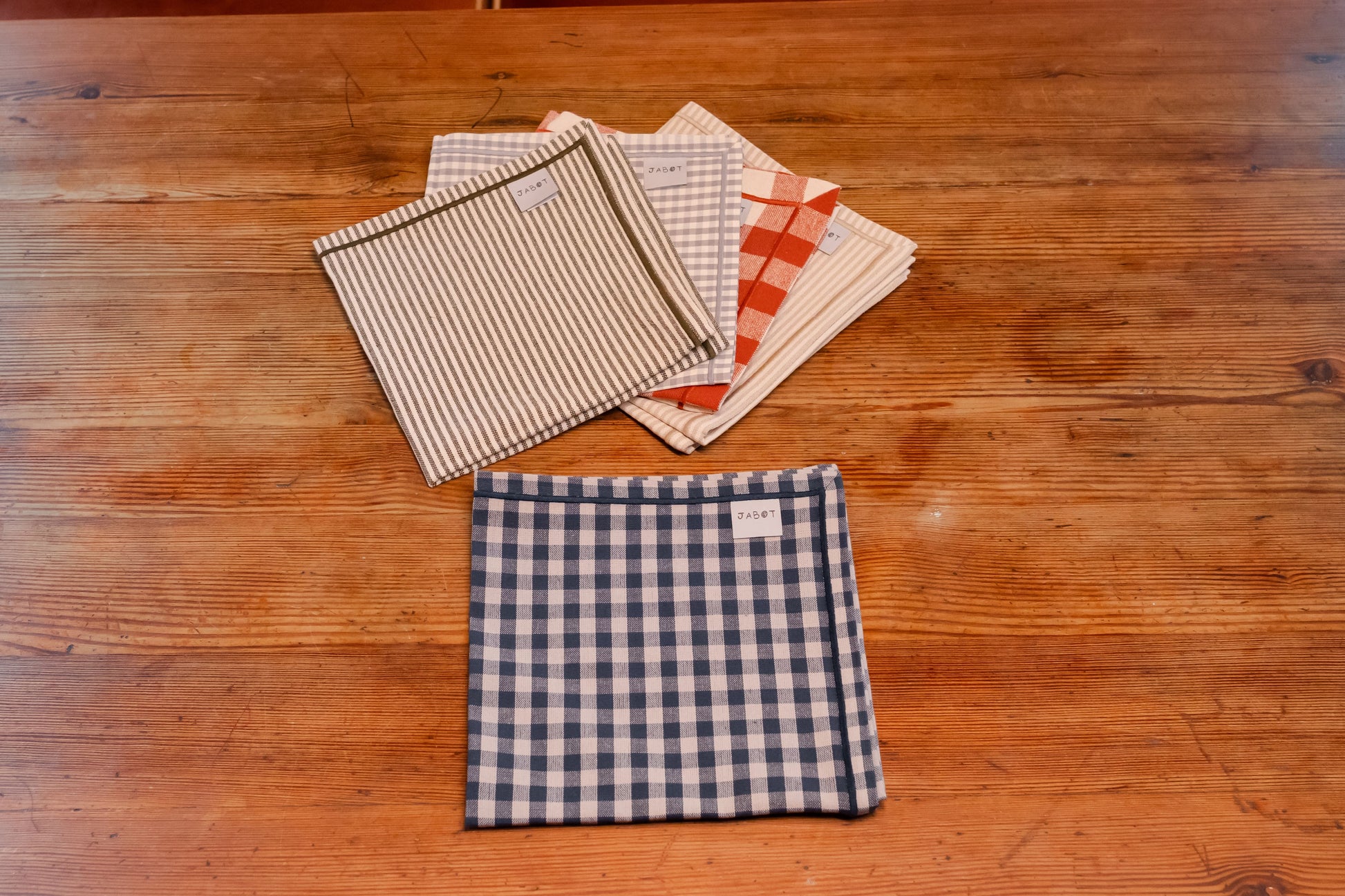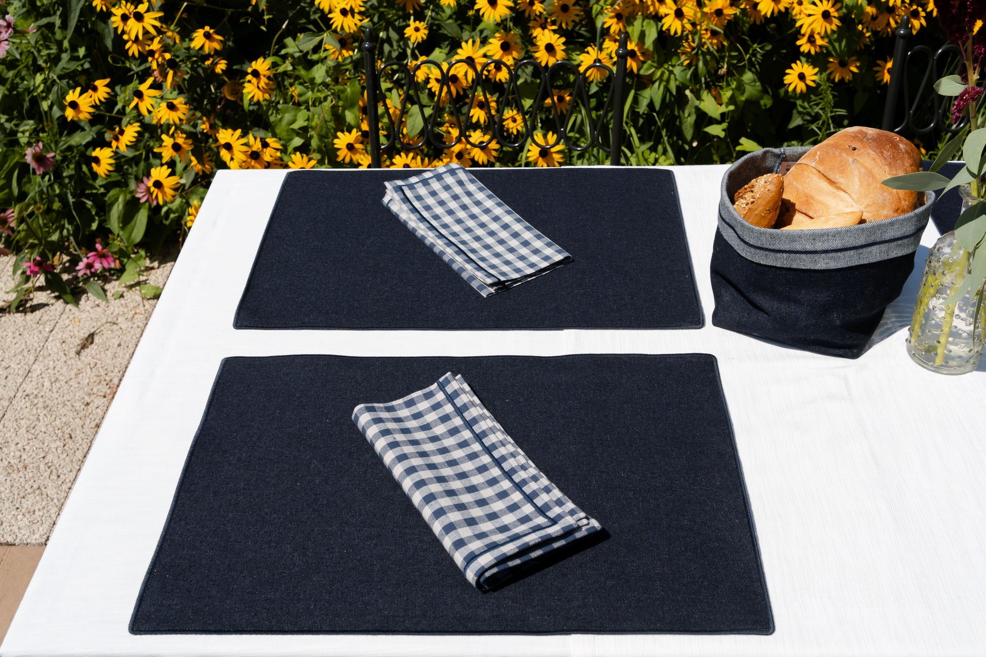 Tovagliolo a quadri (1cm) blu/greige con cucitura lungo i bordi blu 47x47.